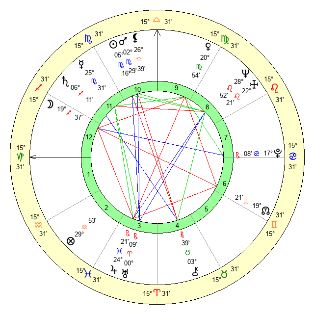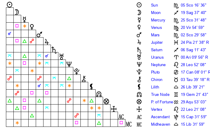 | Sun | 5 Scorpio 17 | 6 Scorpio 31 | 14 Aquarius 39 |