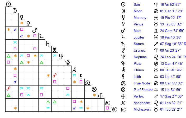 | Sun | 16 Aries 53 | 18 Aries 7 | 21 Cancer 14 |