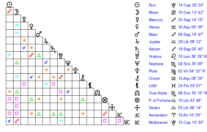Pluto | 2 Virgo 3 | 1 Aquarius 12 | 0 Virgo 32 |