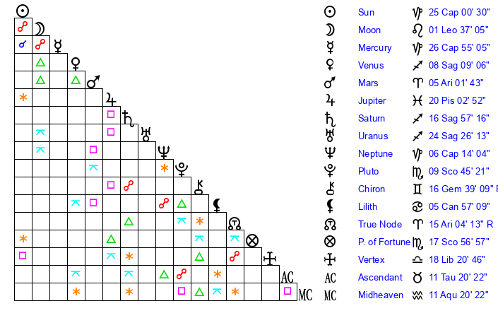 | Mercury | 26 Capricorn 56 | 10 Capricorn 38 | 13 Pisces 9 |