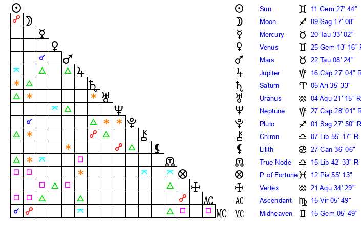 | Mercury | 20 Taurus 33 | 14 Gemini 36 | 26 Gemini 45 |