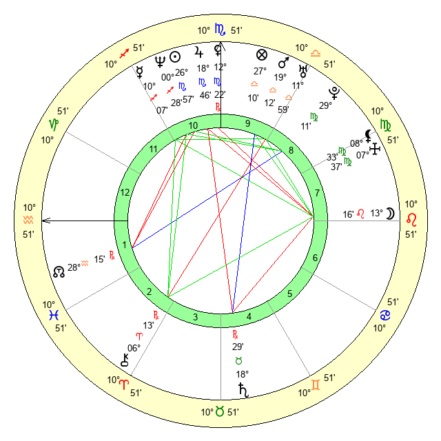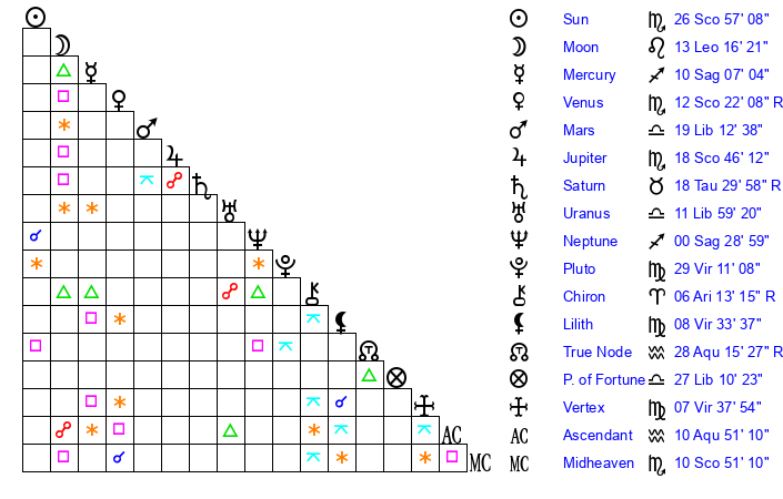 | Moon | 13 Leo 20 | 21 Scorpio 22 | 16 Leo 58 |