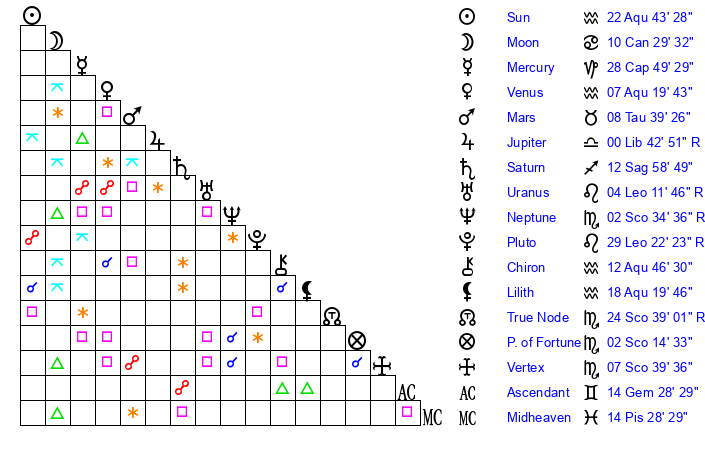 | Neptune | 2 Scorpio 34 | 28 Pisces 17 | 1 Scorpio 15 |