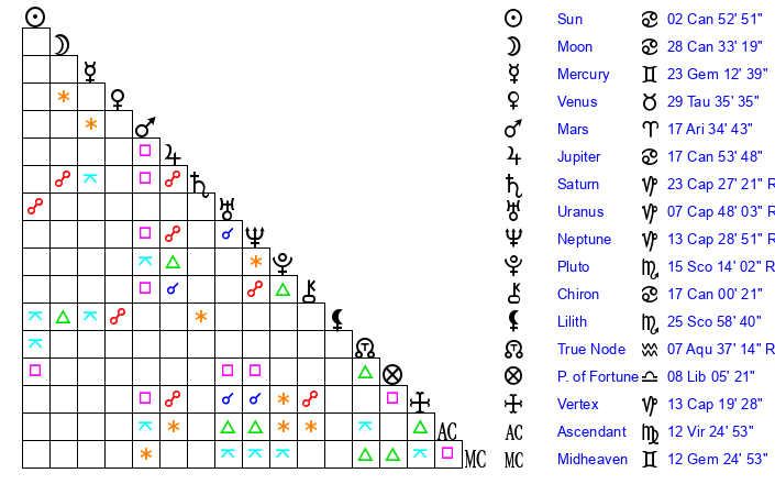 | Moon | 28 Cancer 32 | 22 Gemini 49 | 7 Scorpio 19 |