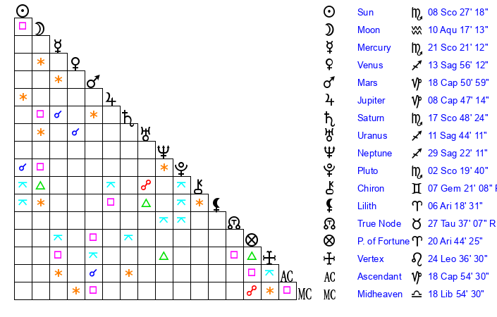 | Saturn | 18 Scorpio 6 | 25 Pisces 42 | 22 Scorpio 54 |