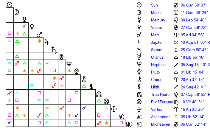 | Neptune | 5 Sagittarius 14 | 2 Aries 9 | 4 Sagittarius 39 |