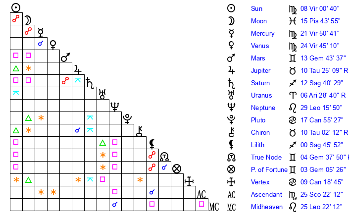 | Mercury | 21 Virgo 51 | 26 Leo 30 | 7 Sagittarius 50 |