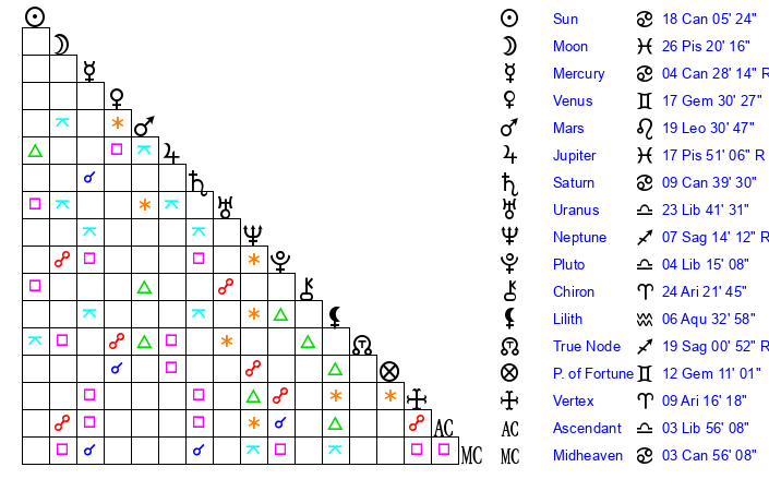 | Sun | 18 Cancer 5 | 18 Cancer 44 | 6 Virgo 58 |