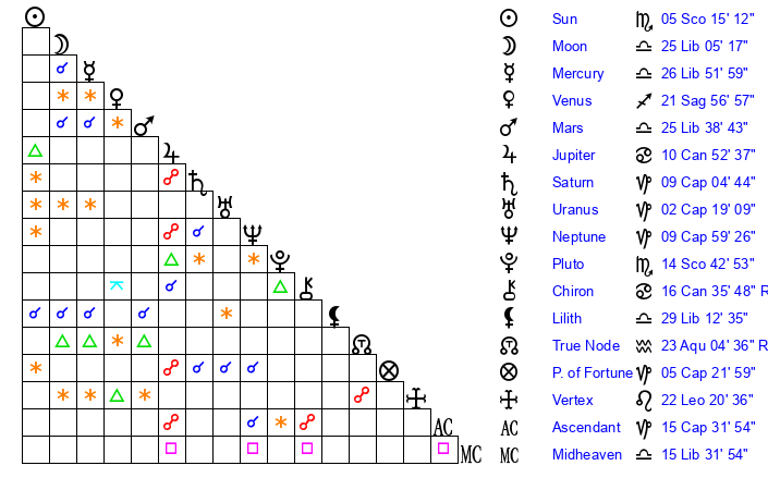 | Moon | 25 Libra 5 | 24 Capricorn 21 | 12 Aquarius 32 |