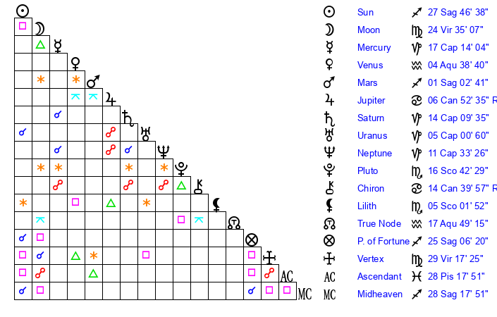 | Moon | 24 Virgo 34 | 24 Sagittarius 4 | 9 Capricorn 13 |