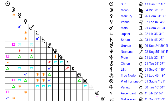 | Mercury | 26 Gemini 32 | 9 Leo 47 | 4 Virgo 8 |