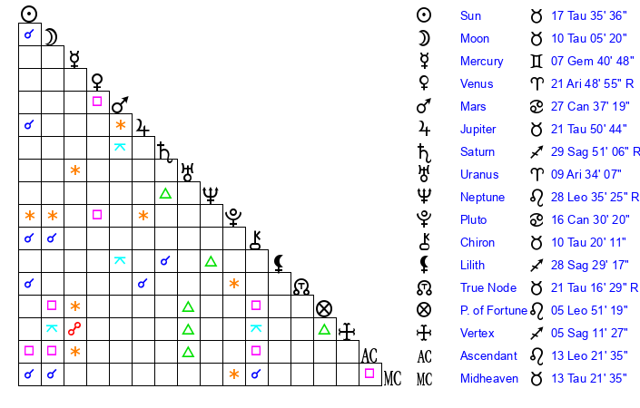 | Sun | 17 Taurus 36 | 18 Taurus 21 | 19 Leo 28 |