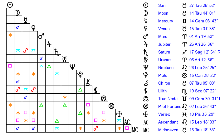 | Moon | 14 Taurus 46 | 5 Aquarius 27 | 3 Sagittarius 42 |