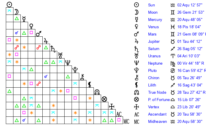 | Sun | 2 Aquarius 13 | 2 Aquarius 56 | 7 Taurus 54 |