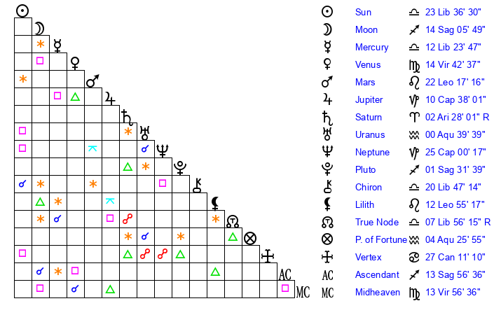 Sun | 23 Libra 36 | 23 Libra 49 | 21 Scorpio 36 |