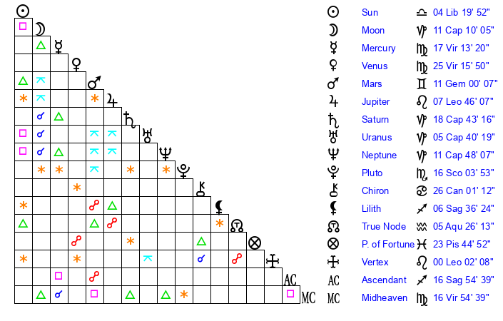 | Moon | 11 Capricorn 12 | 9 Sagittarius 37 | 22 Aries 8 |