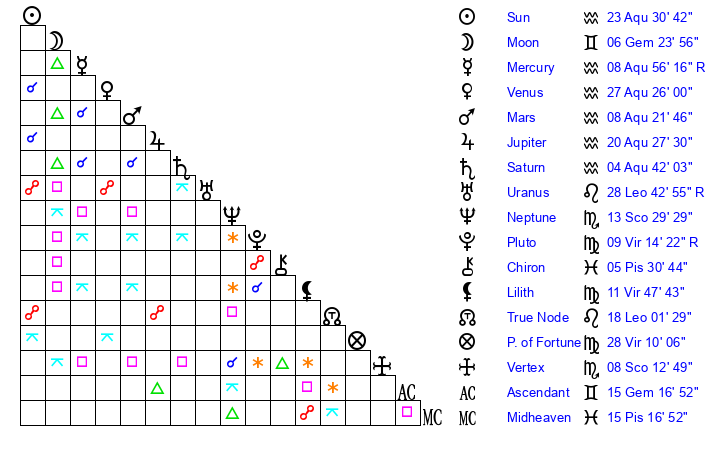 | Jupiter | 20 Aquarius 19 | 11 Gemini 23 | 4 Pisces 19 |