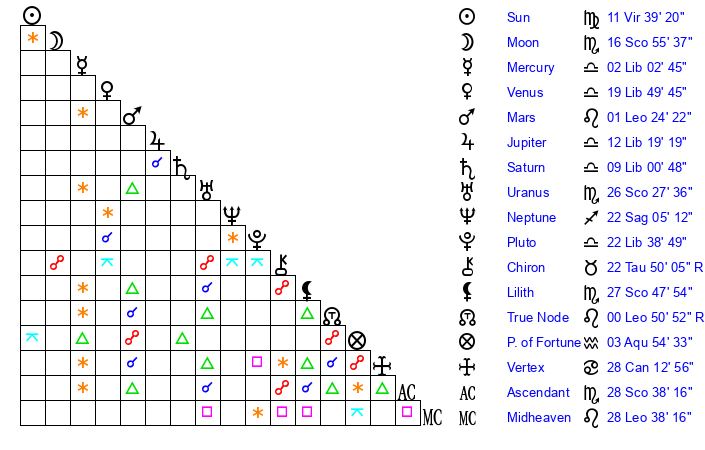 Sun | 11 Virgo 40 | 12 Virgo 0 | 24 Libra 49 |
