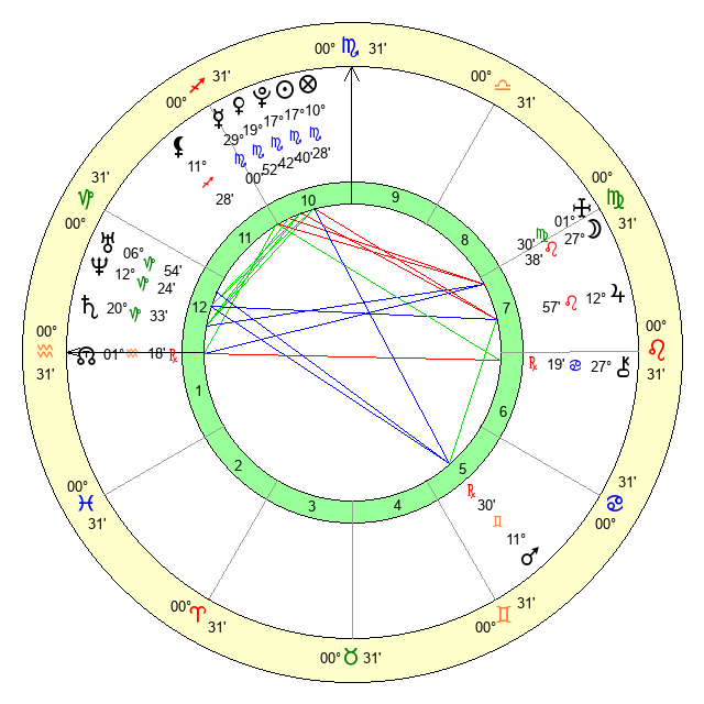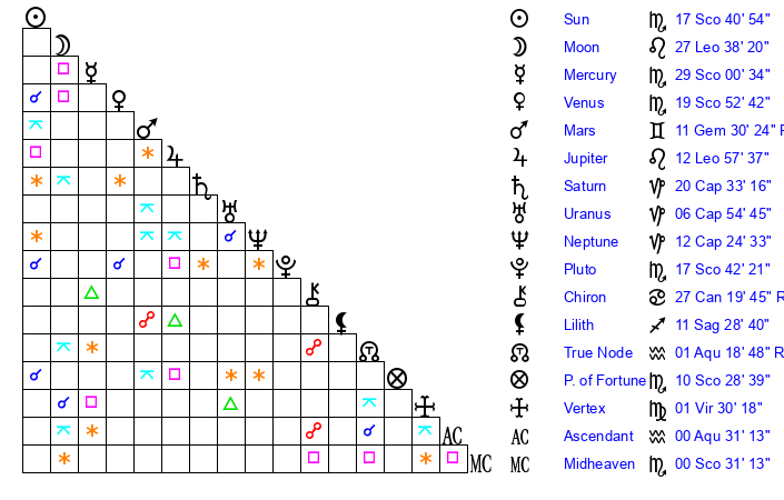 | Moon | 27 Leo 33 | 2 Pisces 40 | 21 Scorpio 25 |