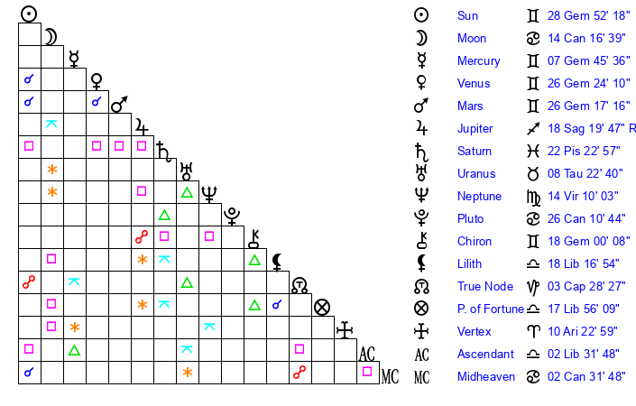 | Sun | 28 Gemini 52 | 29 Gemini 20 | 24 Virgo 19 |