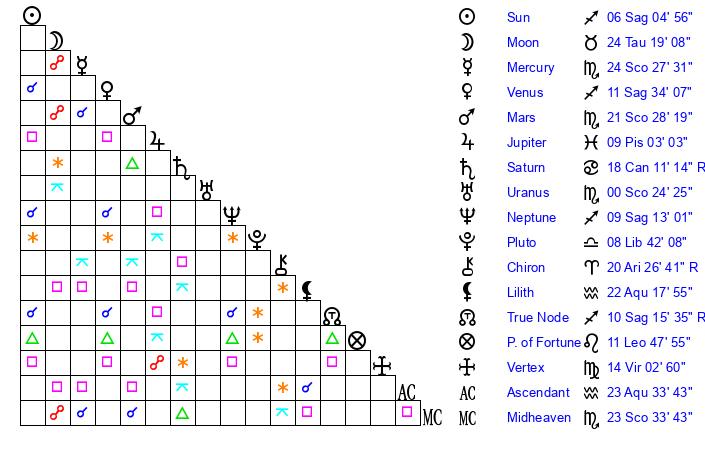 | Neptune | 9 Sagittarius 12 | 29 Pisces 24 | 10 Sagittarius 58 |