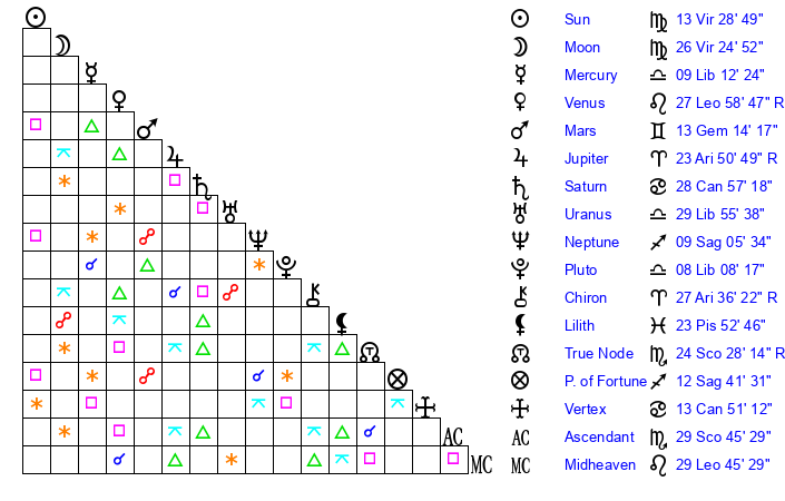 | Sun | 13 Virgo 28 | 14 Virgo 21 | 2 Scorpio 39 |