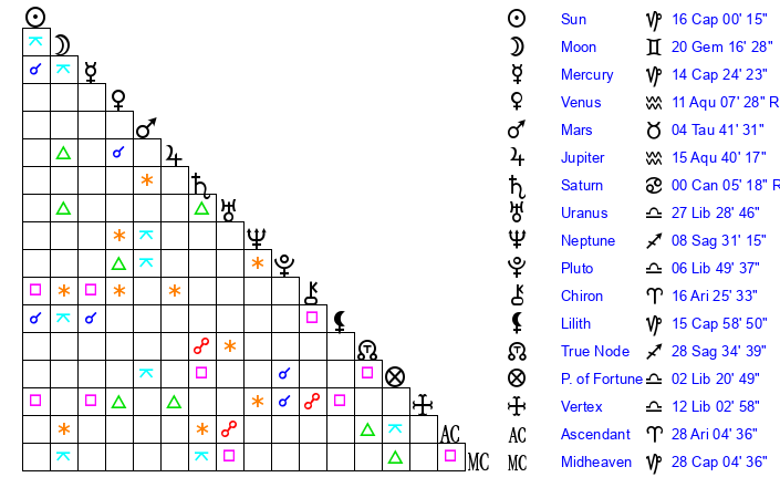 | Jupiter | 15 Aquarius 32 | 12 Gemini 38 | 27 Aquarius 33 |