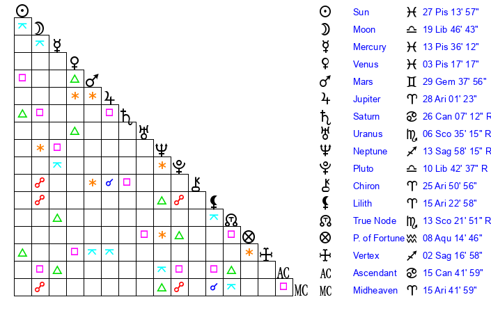 | Sun | 27 Pisces 14 | 27 Pisces 21 | 15 Taurus 18 |