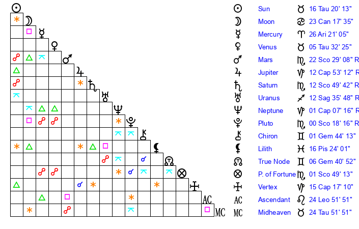| Sun | 16 Taurus 20 | 16 Taurus 25 | 25 Gemini 42 |