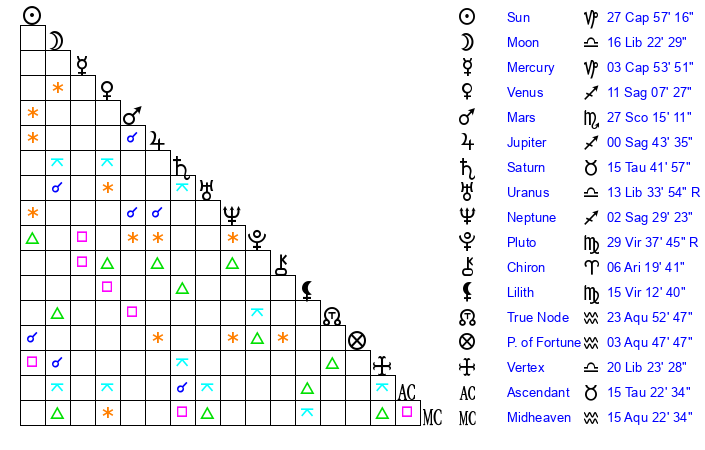 | Saturn | 15 Taurus 57 | 15 Pisces 59 | 18 Taurus 37 |