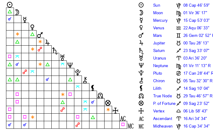 | Sun | 8 Capricorn 47 | 9 Capricorn 15 | 16 Aries 24 |