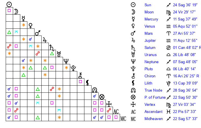 | Sun | 24 Sagittarius 36 | 24 Sagittarius 59 | 17 Aquarius 32 |