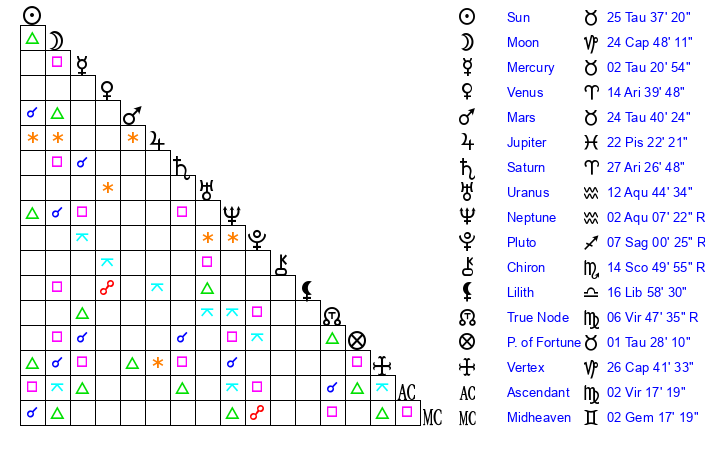| Moon | 24 Capricorn 47 | 10 Capricorn 50 | 21 Capricorn 48 |
