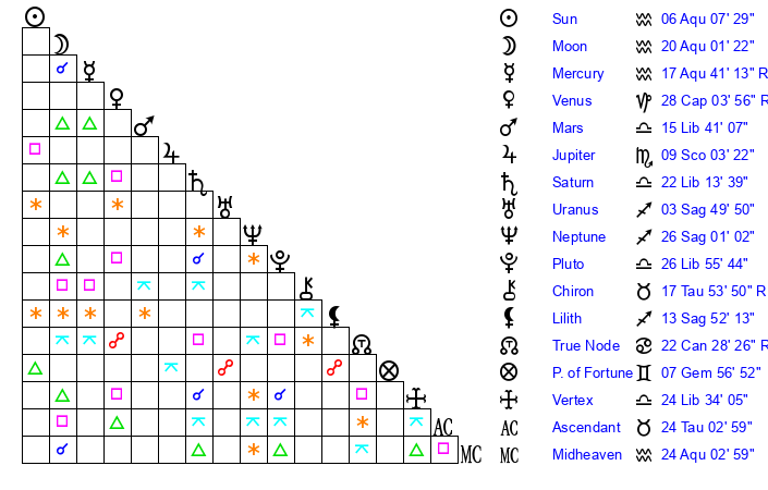 | Moon | 20 Aquarius 6 | 27 Sagittarius 53 | 26 Virgo 20 |