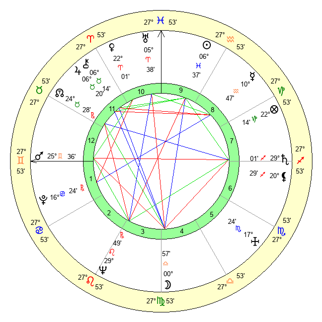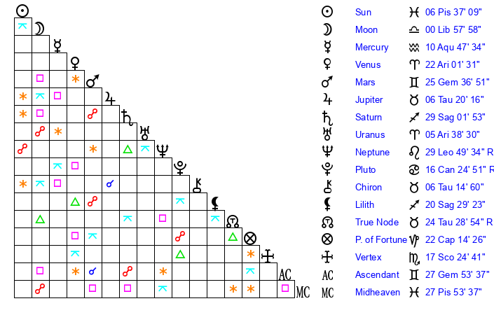 | Moon | 0 Libra 57 | 6 Aquarius 26 | 22 Pisces 43 |