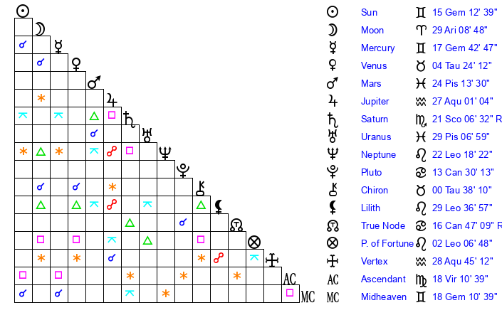 | Sun | 15 Gemini 13 | 16 Gemini 14 | 20 Virgo 8 |