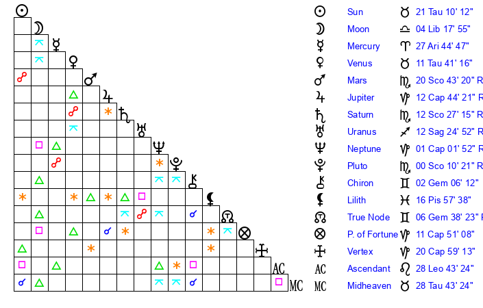 | Mars | 20 Scorpio 42 | 10 Leo 40 | 11 Scorpio 42 |
