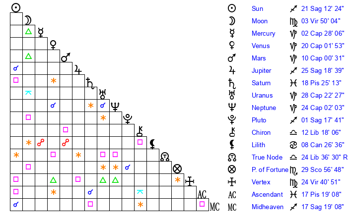 | Sun | 21 Sagittarius 12 | 22 Sagittarius 11 | 20 Capricorn 45 |