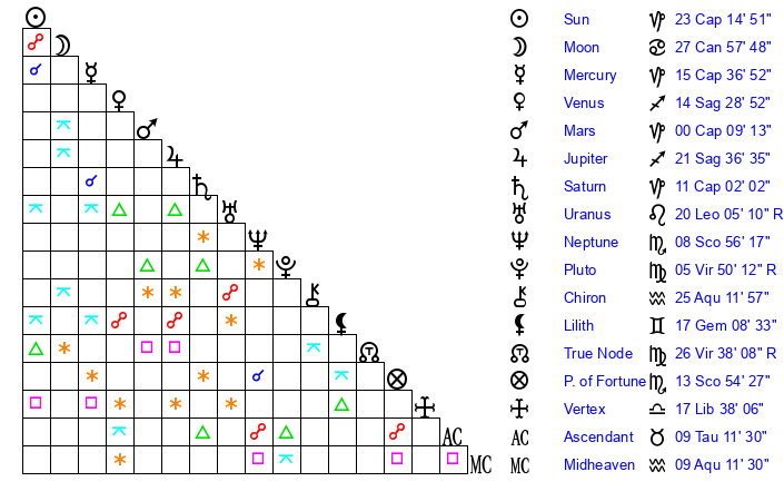 | Mars | 0 Capricorn 9 | 26 Cancer 53 | 19 Aquarius 20 |