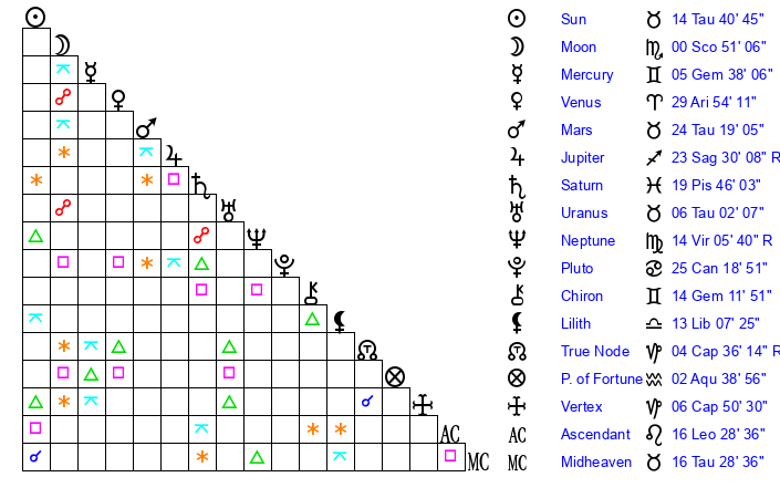 | Sun | 14 Taurus 40 | 15 Taurus 7 | 9 Leo 52 |
