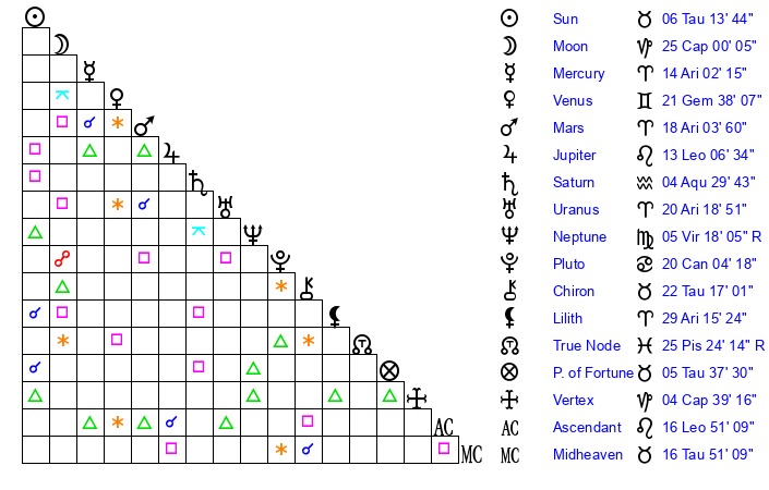 | Moon | 25 Capricorn 3 | 21 Aries 2 | 9 Gemini 46 |