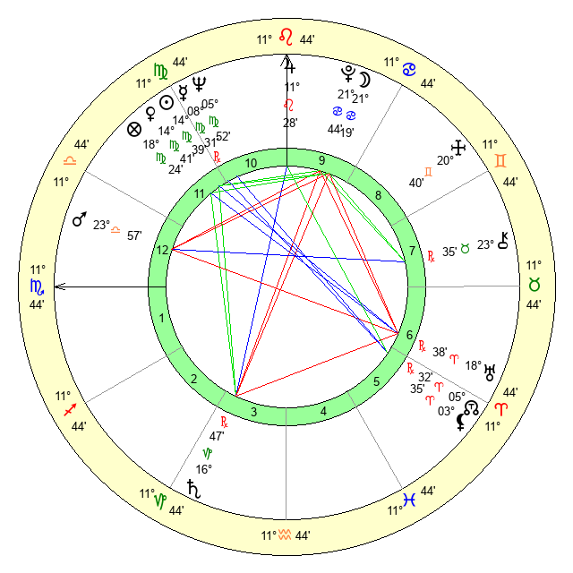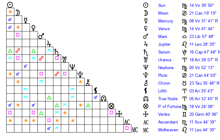 | Neptune | 5 Virgo 38 | 27 Pisces 17 | 3 Virgo 24 |