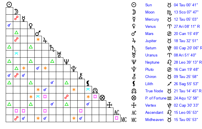 | Moon | 12 Scorpio 59 | 21 Pisces 16 | 8 Taurus 4 |
