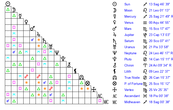 | Neptune | 22 Leo 12 | 27 Pisces 18 | 19 Leo 53 |