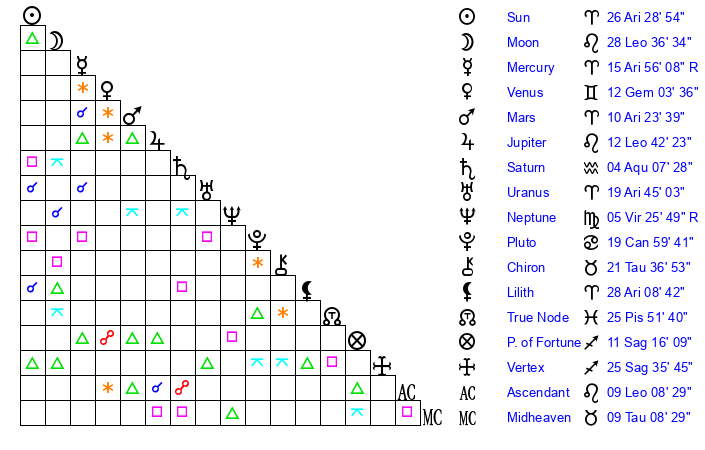 | Mercury | 15 Aries 55 | 0 Aries 19 | 22 Leo 36 |