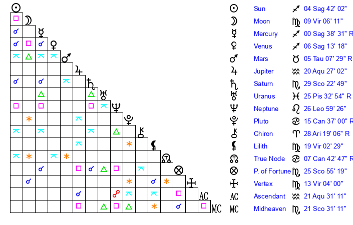 | Mercury | 0 Sagittarius 38 | 21 Scorpio 4 | 27 Pisces 4 |