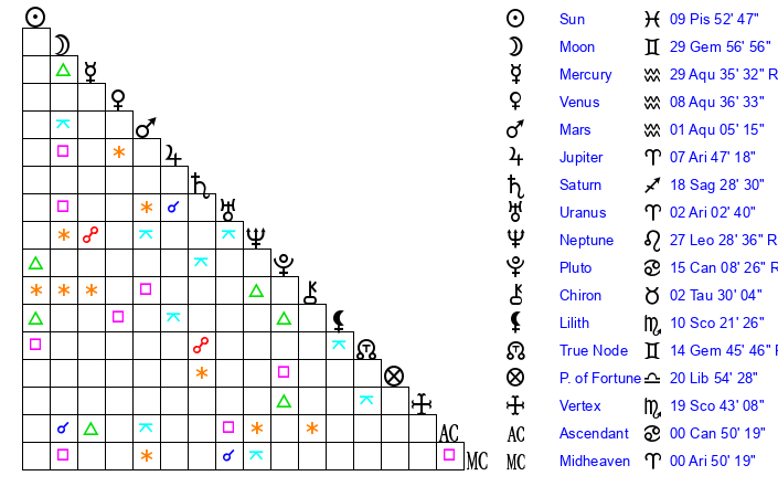 | Sun | 9 Pisces 53 | 11 Pisces 22 | 14 Gemini 45 |