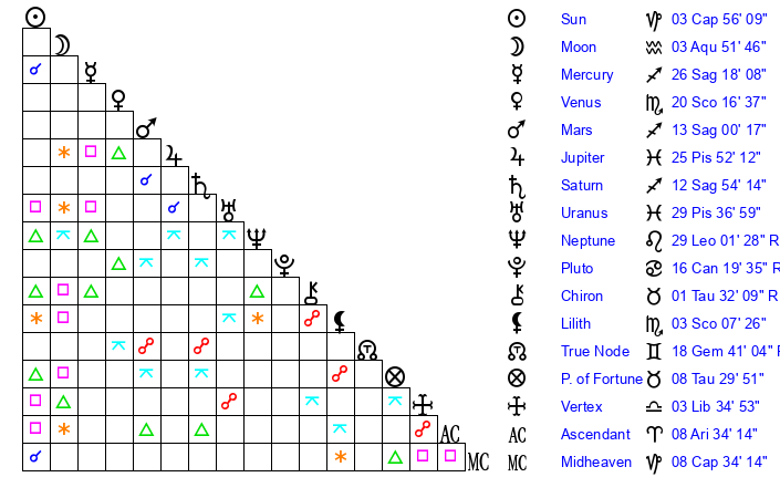 | Sun | 3 Capricorn 56 | 5 Capricorn 10 | 12 Aries 42 |