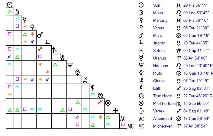 | Neptune | 29 Leo 14 | 29 Pisces 37 | 29 Leo 9 |