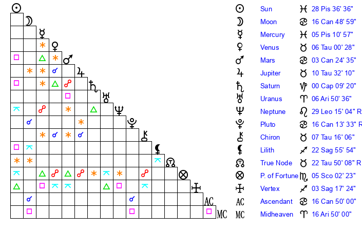 | Moon | 16 Cancer 58 | 28 Scorpio 12 | 18 Capricorn 23 |